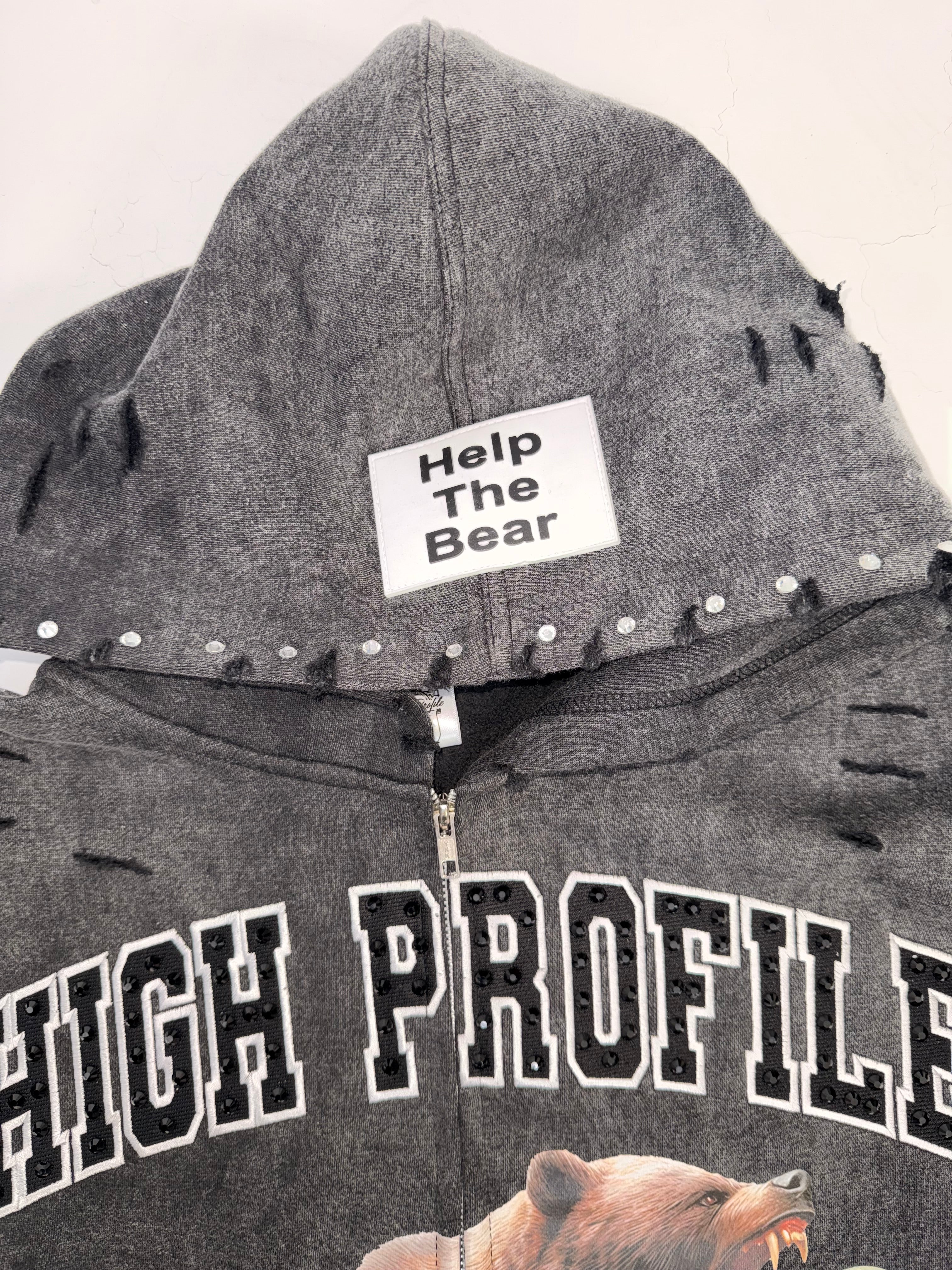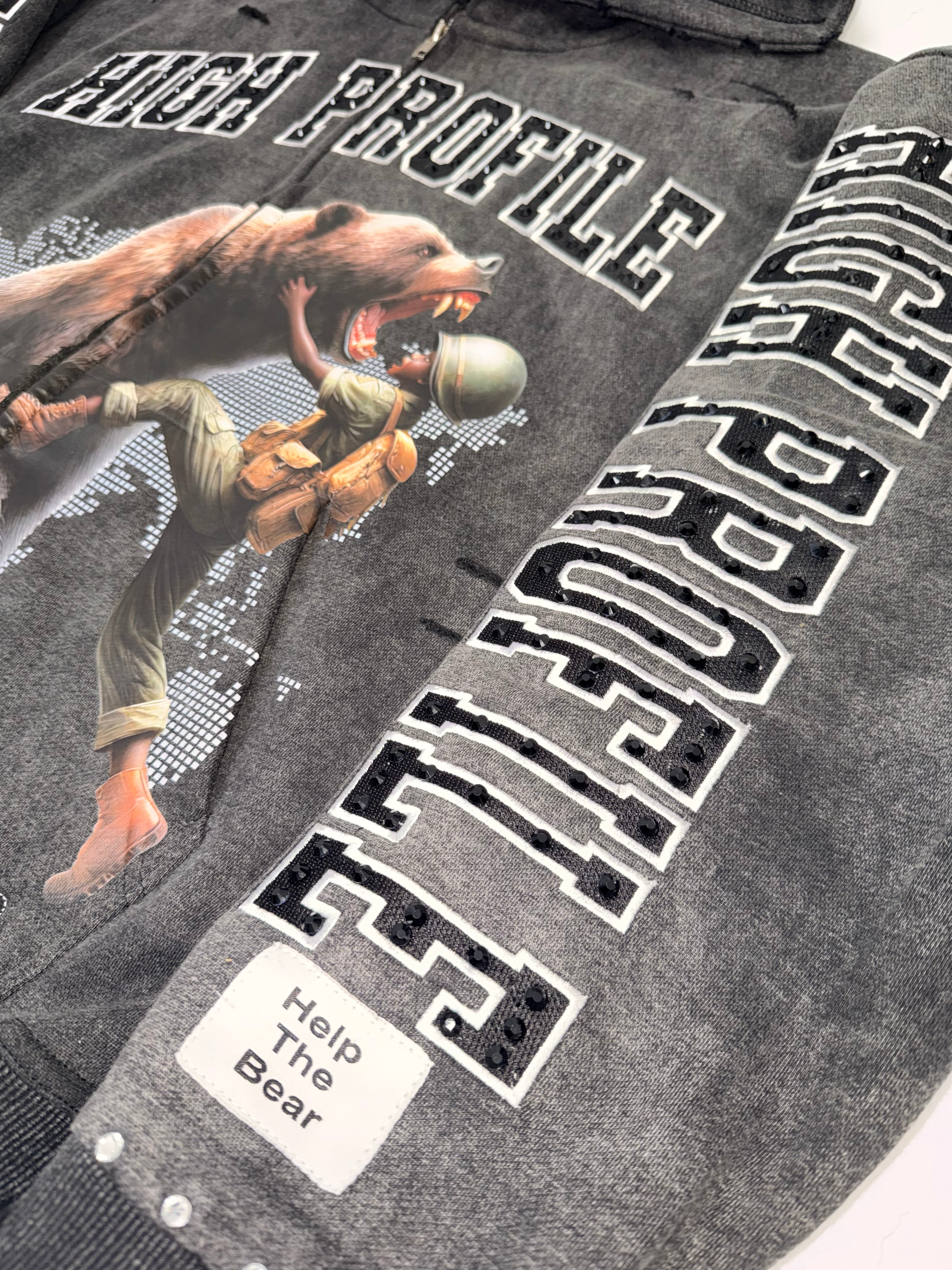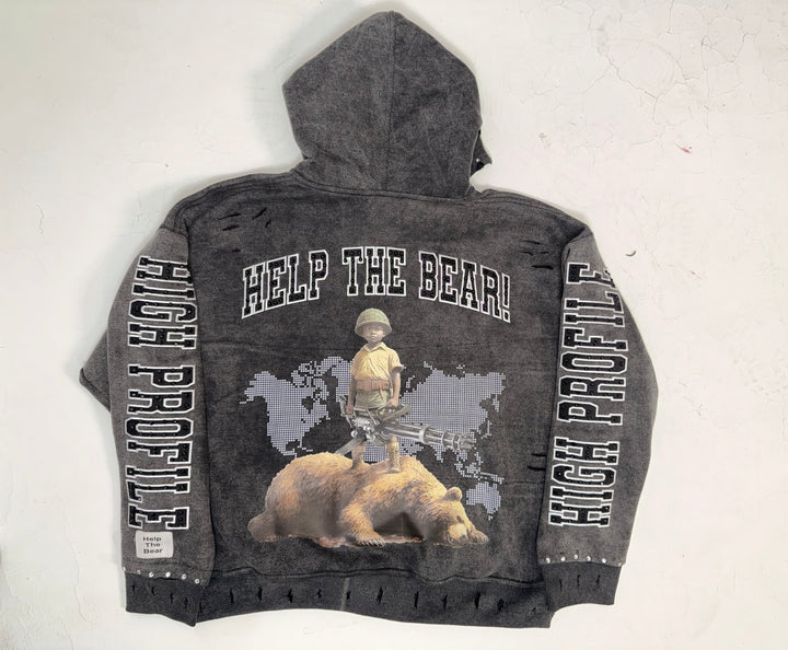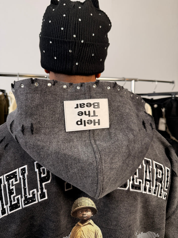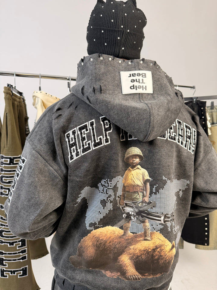 An acid-wash finish gives the hoodie its rugged, battle-tested aesthetic, while clean reinforced stitching ensures long-lasting wear. The piece is elevated with rhinestone accents and embroidered detailing, adding subtle shine and luxury without losing the raw edge that defines the Help The Bear Collection.