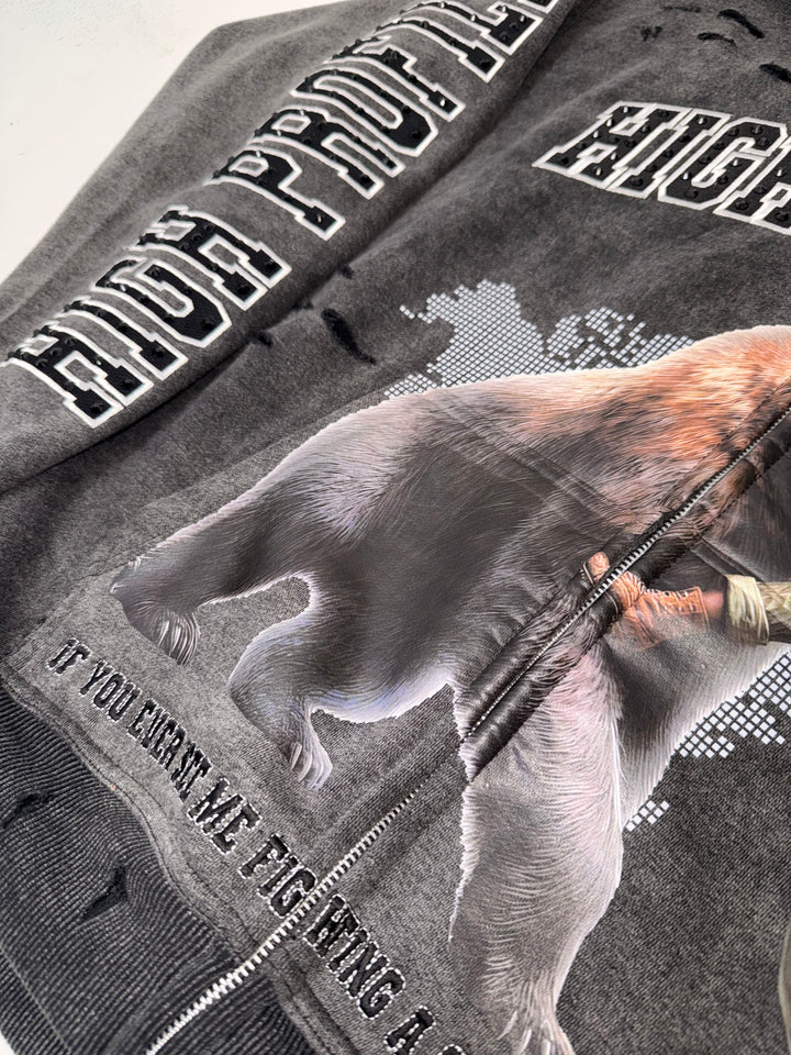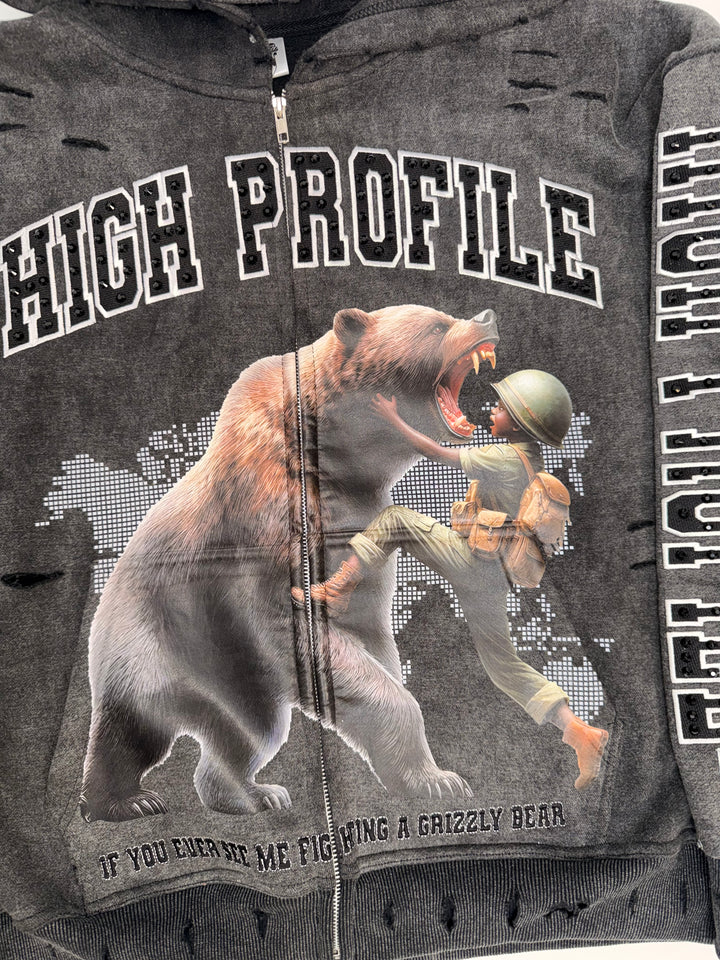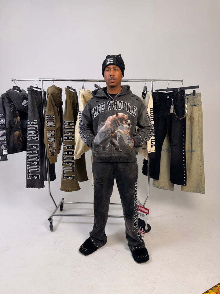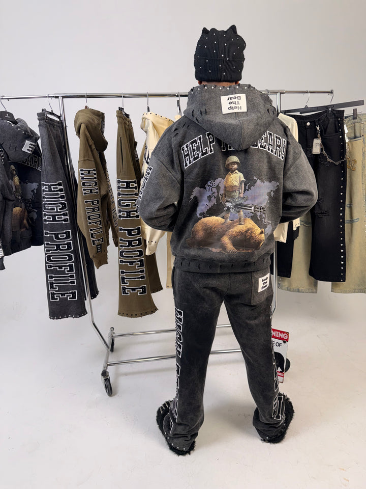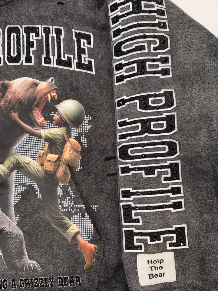 An acid-wash finish gives the hoodie its rugged, battle-tested aesthetic, while clean reinforced stitching ensures long-lasting wear. The piece is elevated with rhinestone accents and embroidered detailing, adding subtle shine and luxury without losing the raw edge that defines the Help The Bear Collection.