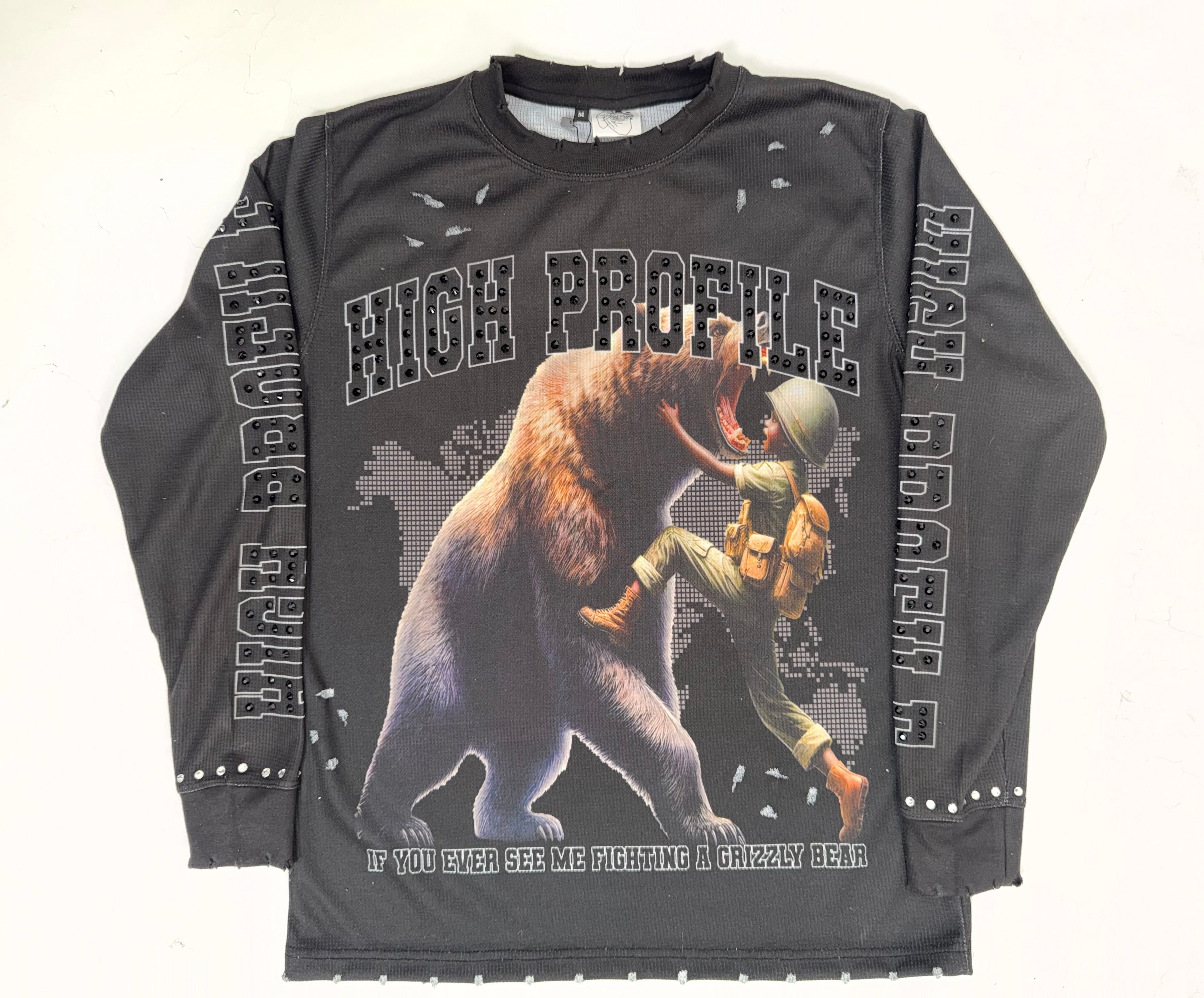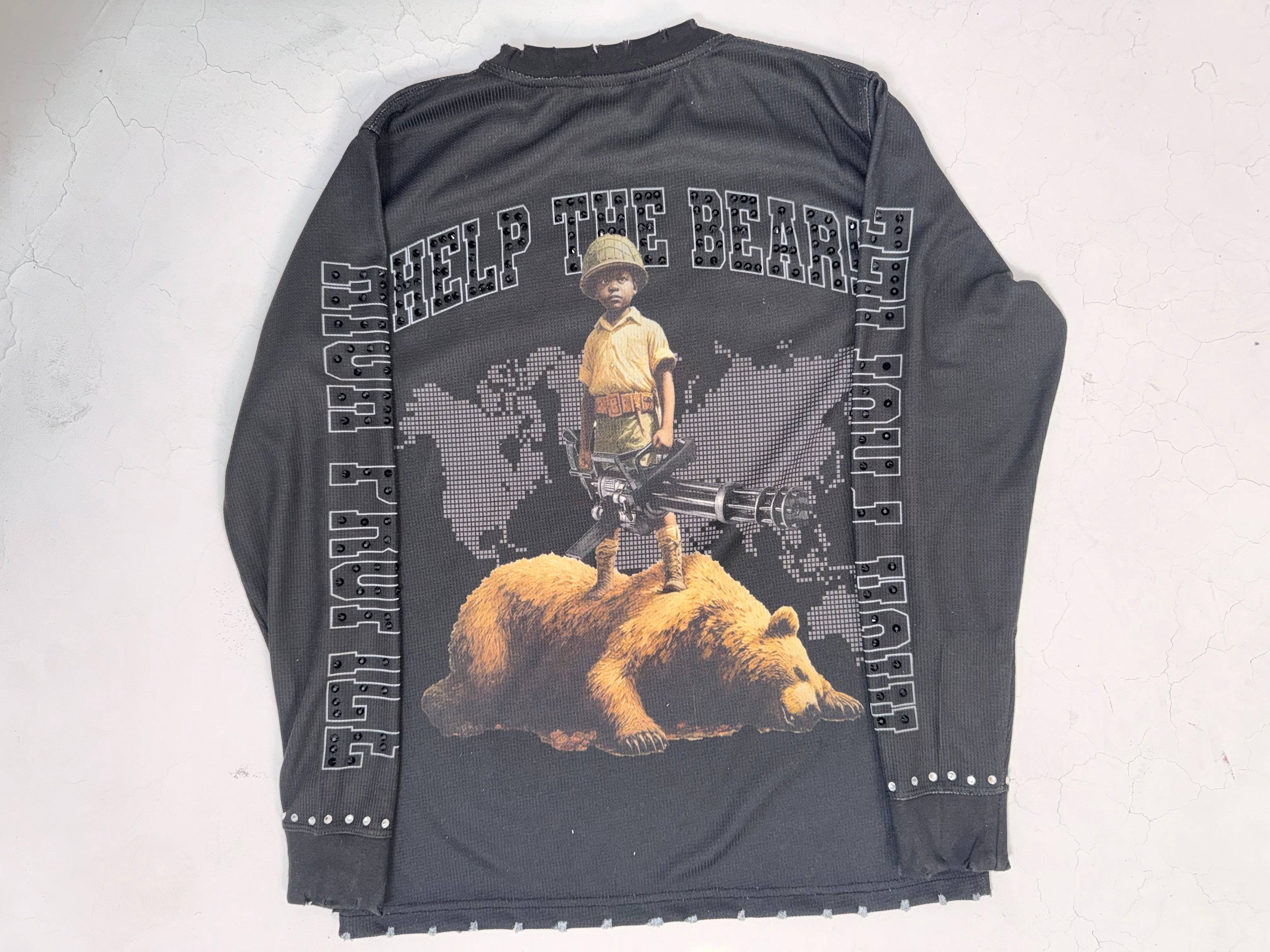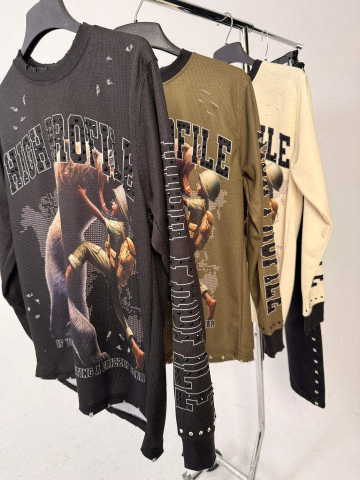 Crafted from high-quality premium cotton with a soft waffle texture, it offers warmth, durability, and a structured, relaxed fit. Each piece features a detailed bear-fight graphic, capturing the raw force and resilience that define the Help The Bear Collection.