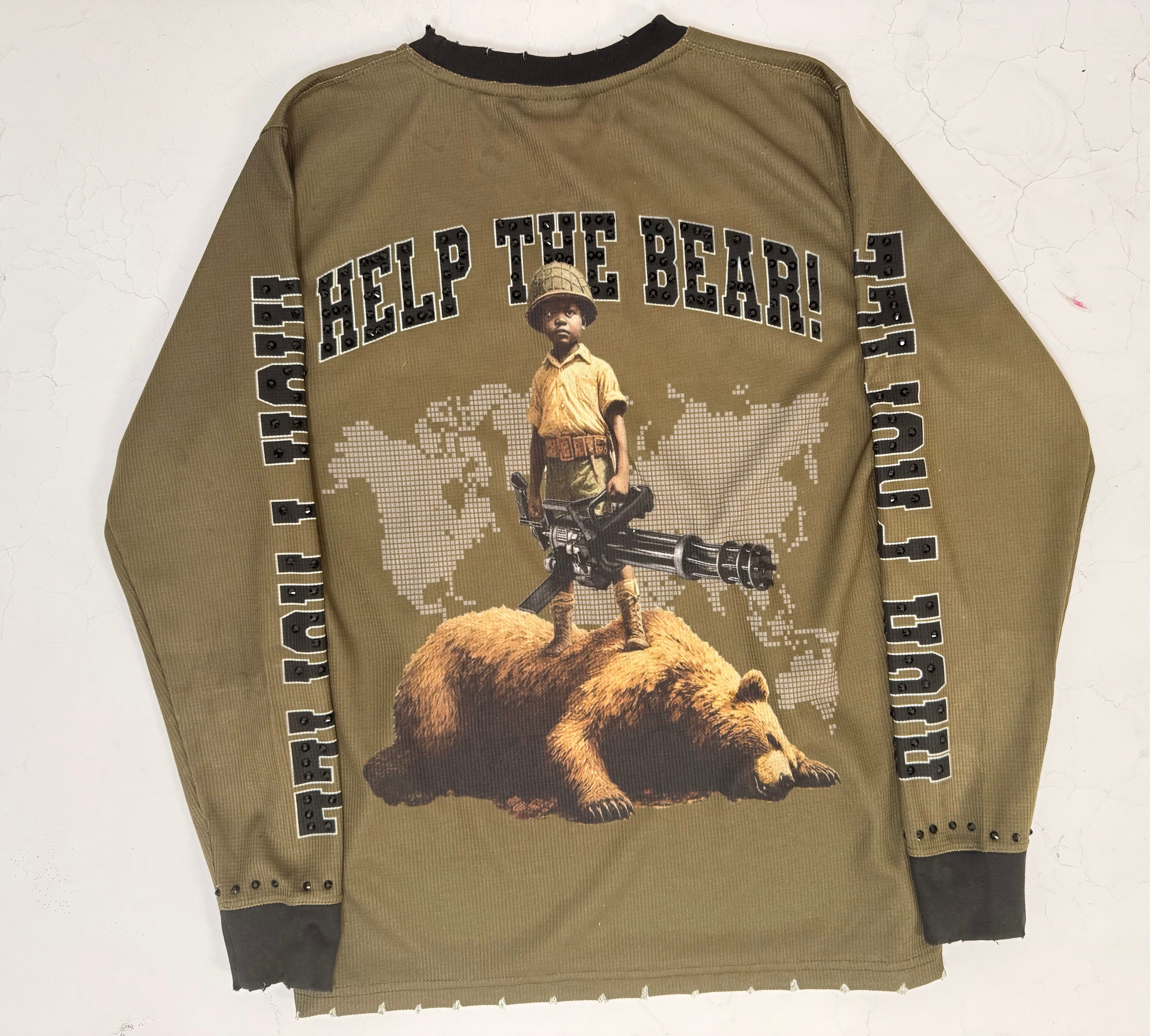 Crafted from high-quality premium cotton with a soft waffle texture, it offers warmth, durability, and a structured, relaxed fit. Each piece features a detailed bear-fight graphic, capturing the raw force and resilience that define the Help The Bear Collection.