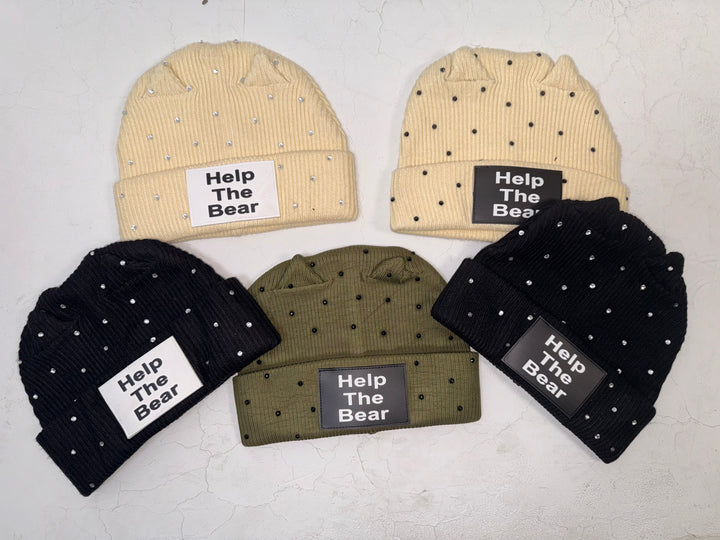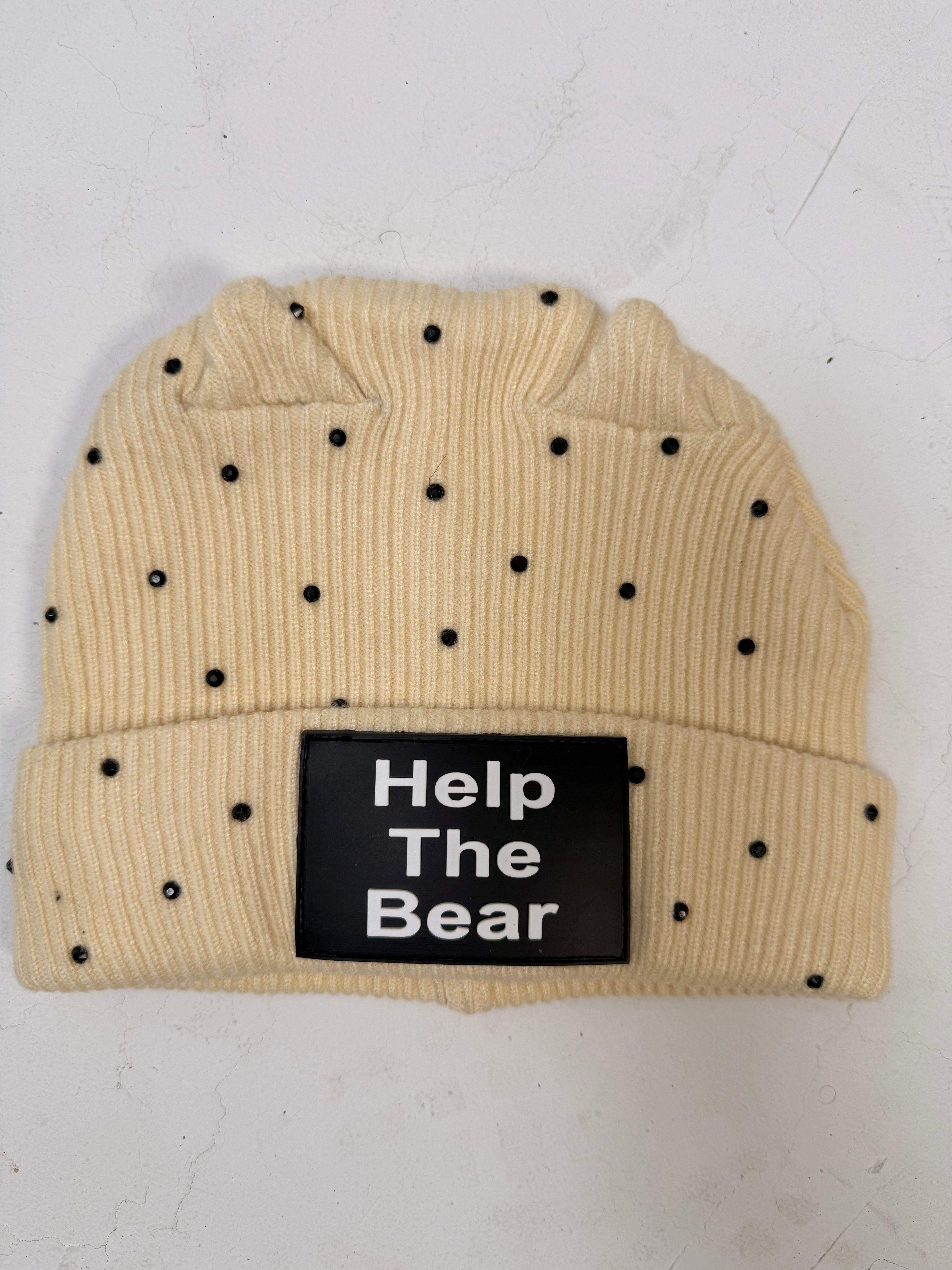 Help The Bear Rhinestone Beanie — Bone (black patch)