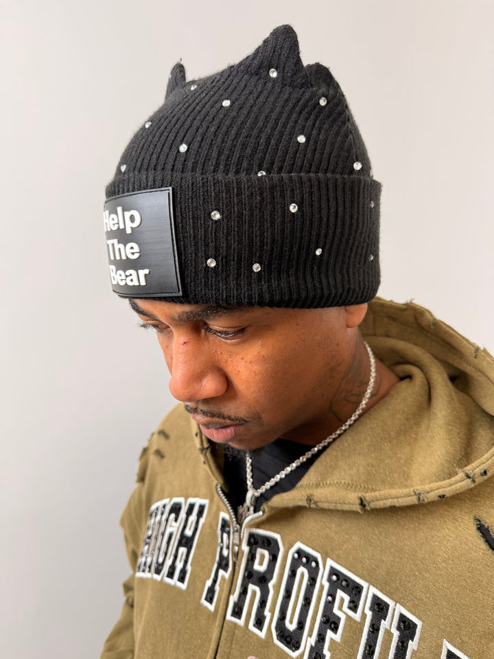 Elevated, gritty, and impossible to ignore — the Help The Bear Rhinestone Beanie is designed for those who carry presence without saying a word. This premium knit beanie features a bold Help The Bear rubber patch (available in white or black) paired with a subtle rhinestone pattern that adds edge without losing the raw street aesthetic.